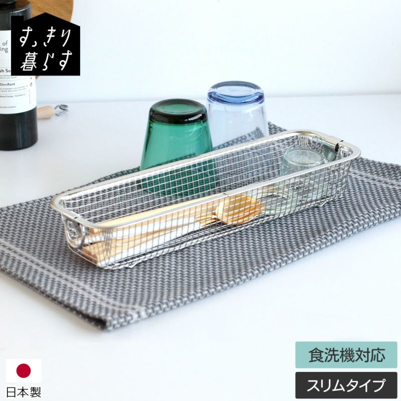 お箸やスプーン・フォークなど、細かいカトラリー類の水切りに最適な水切りかご。スリムサイズでシンク横にもすっきり置くことができ、生活感を抑え、整ったおしゃれなキッチンを叶える省スペース設計です。18-8ステンレス製で錆びにくく、脚高仕様により通気性が良く衛生的。スタッキングや引っ掛け収納も可能で、使い勝手とデザイン性を両立しています。食洗機で丸洗いでき、お手入れも簡単。モノづくりの町・新潟県燕三条で丁寧に仕上げられた、機能美あふれるオールステンレスの水切りかごです。