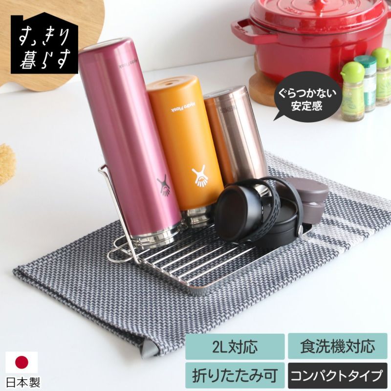 乾きにくいジャグボトルやマグボトルを、斜めに立てかけてしっかり乾燥できるステンレス製のボトルスタンド コンパクト。一般的な水筒を3本置くことができ、グラスや大皿、フライパンなどの乾燥にも便利に使えます。折りたたみ式のため、使わないときはスリムに収納可能。丈夫な18-8ステンレス製で、食洗機にも対応しています。モノづくりの町・新潟県燕三条の職人によって丁寧に仕上げられた、機能美あふれるオールステンレスのボトルスタンドです。